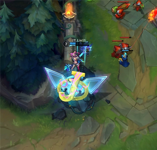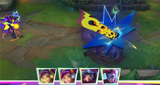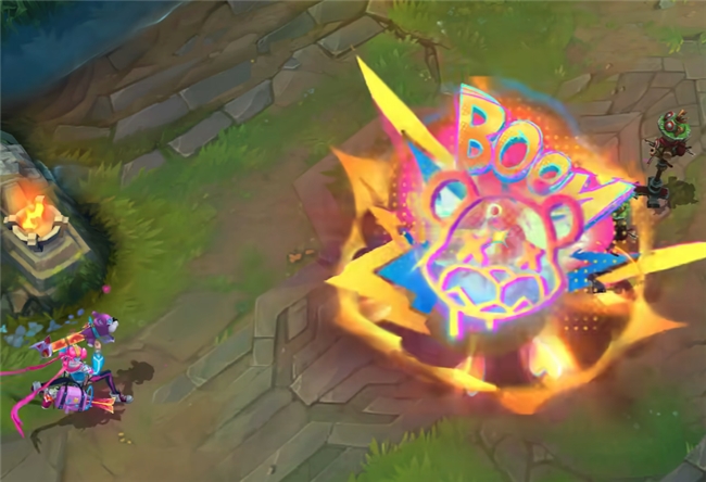全技能的电磁科技风特效非常醒目,大招命中敌人后同样是展现金克丝的玩具小熊画像,色彩上与狂潮·裂变的差别很大。