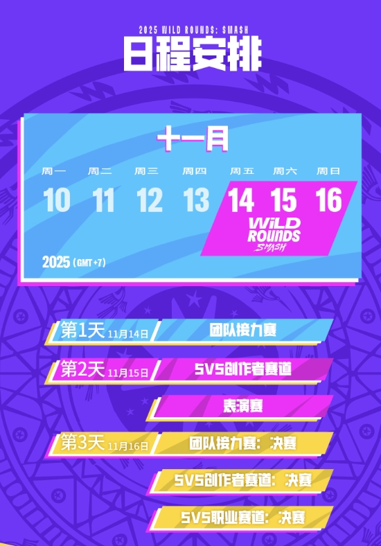 比赛将在11月14日至16日的三天内进行。11月14日北京时间下午4:00,团队接力赛正式拉开帷幕;11月15日北京时间下午3:00,5V5创作者赛道与表演赛将轮番进行;11月16日北京时间下午4:00,将迎来团队接力赛、5V5创作者赛道以及5V5职业赛道的决赛。观众们可以根据自己的时间安排,观看精彩的比赛直播,为自己喜欢的队伍加油助威。